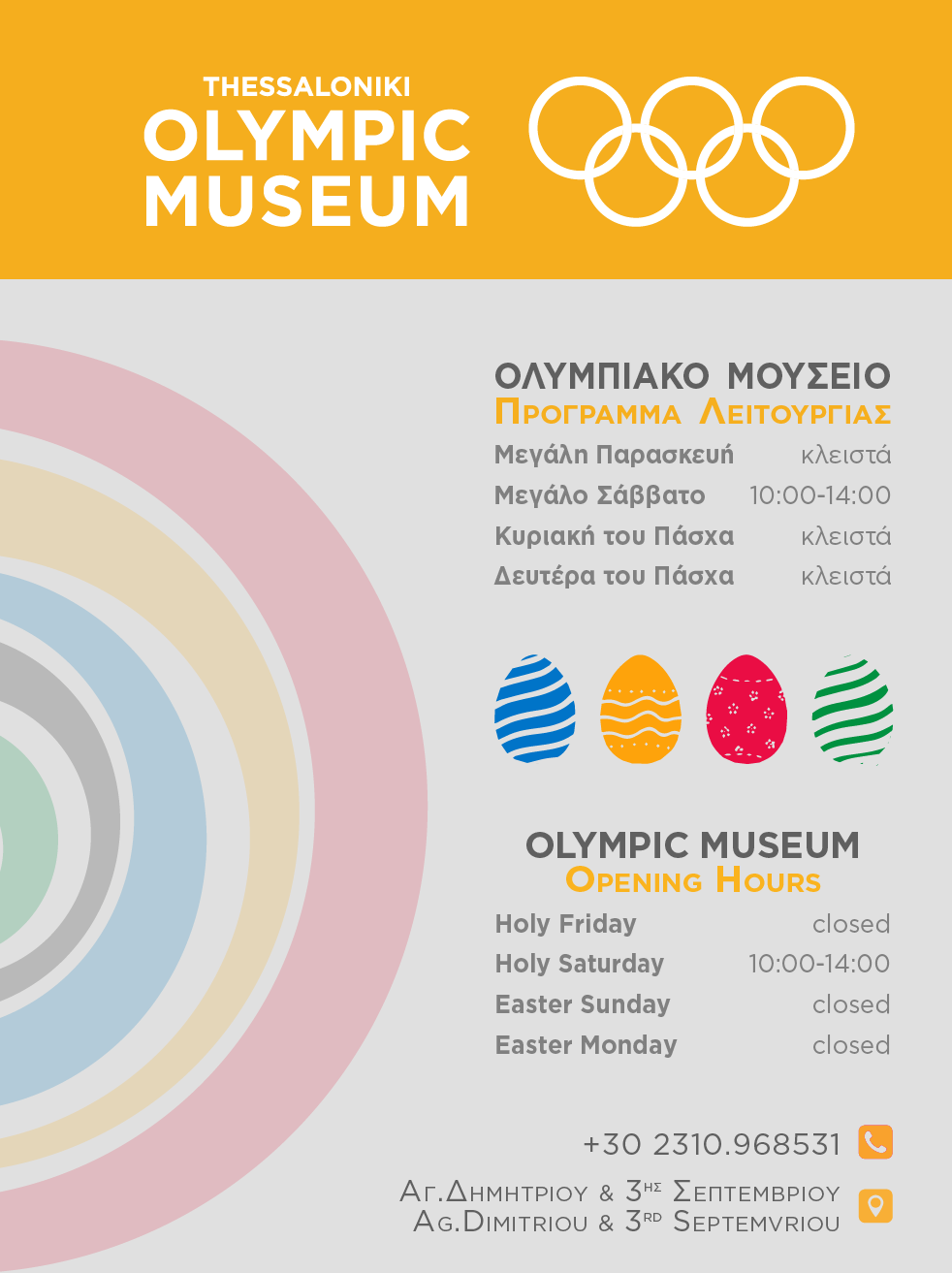 Φεβρουαρίου 1 Καλωσήρθατε στο Ολυμπιακό Μουσείο ΩΡΑΡΙΟ ΛΕΙΤΟΥΡΓΙΑΣ Δευτέρα - Παρασκευή: 09:00 π.μ. - 19:00 μ.μ. Σάββατο: 10:00 π.μ. - 16:00 μ.μ.Κυριακή: 10:00 π.μ. - 14:00 μ.μ. OPENING HOURS Monday - Friday: 09:00 am – 19:00 pmSaturday: 10:00 am - 16:00 pmSunday: 10:00 am - 14:00 pm