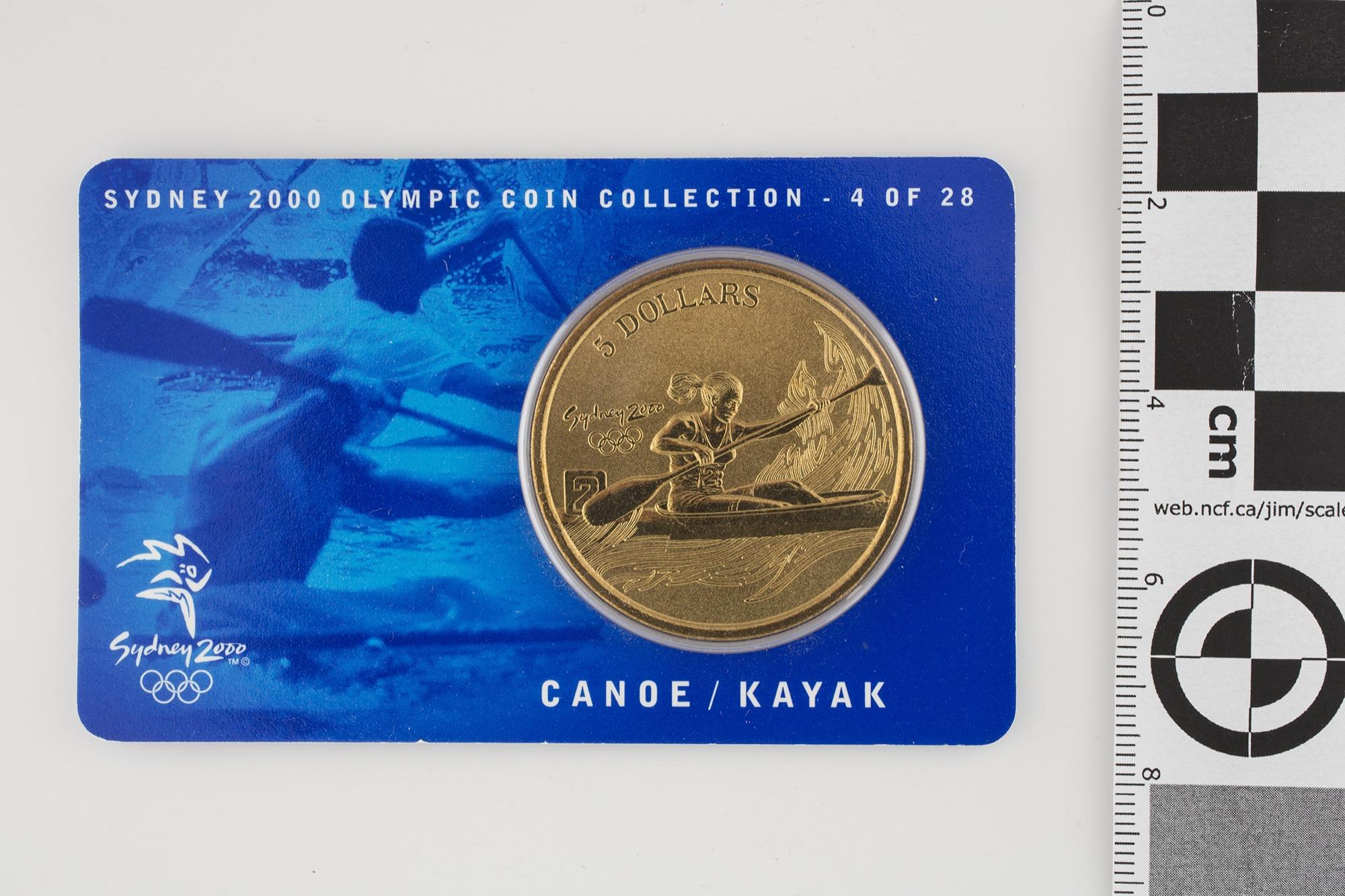 Αναμνηστικό χάλκινο Ολυμπιακό νόμισμα για το άθλημα του κανόε καγιάκ από τους Ολυμπιακούς Αγώνες του Σίδνεϊ το 2000. Στη μπροστινή όψη εικονίζεται αθλήτρια να κωπηλατεί σε κανόε. Περιμετρικά του νομίσματος αναγράφεται "5 DOLLARS" και με μικρότερα γράμματα "SYDNEY 2000". Στην πίσω όψη εικονίζεται η βασίλισσα του Ηνωμένου Βασιλείου Ελισάβετ ΙΙ. Περιμετρικά αναγράφεται "ELISABETH II, AUSTRALIA 2000". Το αναμνηστικό νόμισμα είναι τοποθετημένο σε χάρτινη κάρτα στην οποία αναγράφεται ότι το νόμισμα είναι μέρος συλλογής είκοσι-οκτώ αναμνηστικών νομισμάτων που παρουσιάζουν αθλήματα των ολυμπιακών αγώνων, αποτέλεσμα της συνεργασίας μεταξύ του βασιλικού νομισματοκοπείου της Αυστραλίας και του νομισματοκοπείο του Περθ. Αποτελεί το τέταρτο νόμισμα της συλλογής.