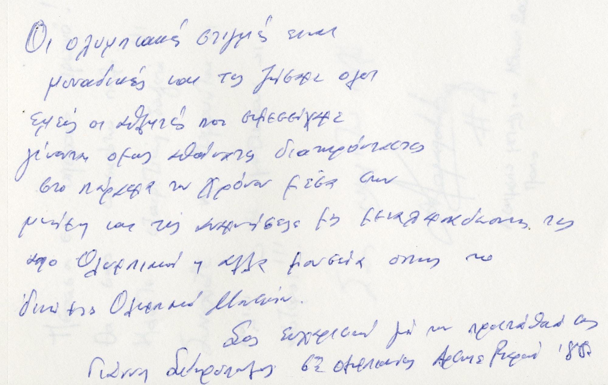 Χειρόγραφη αφιέρωση και υπογραφή του αθλητή της άρσης βαρών Ιωάννη Σιδηρόπουλος.