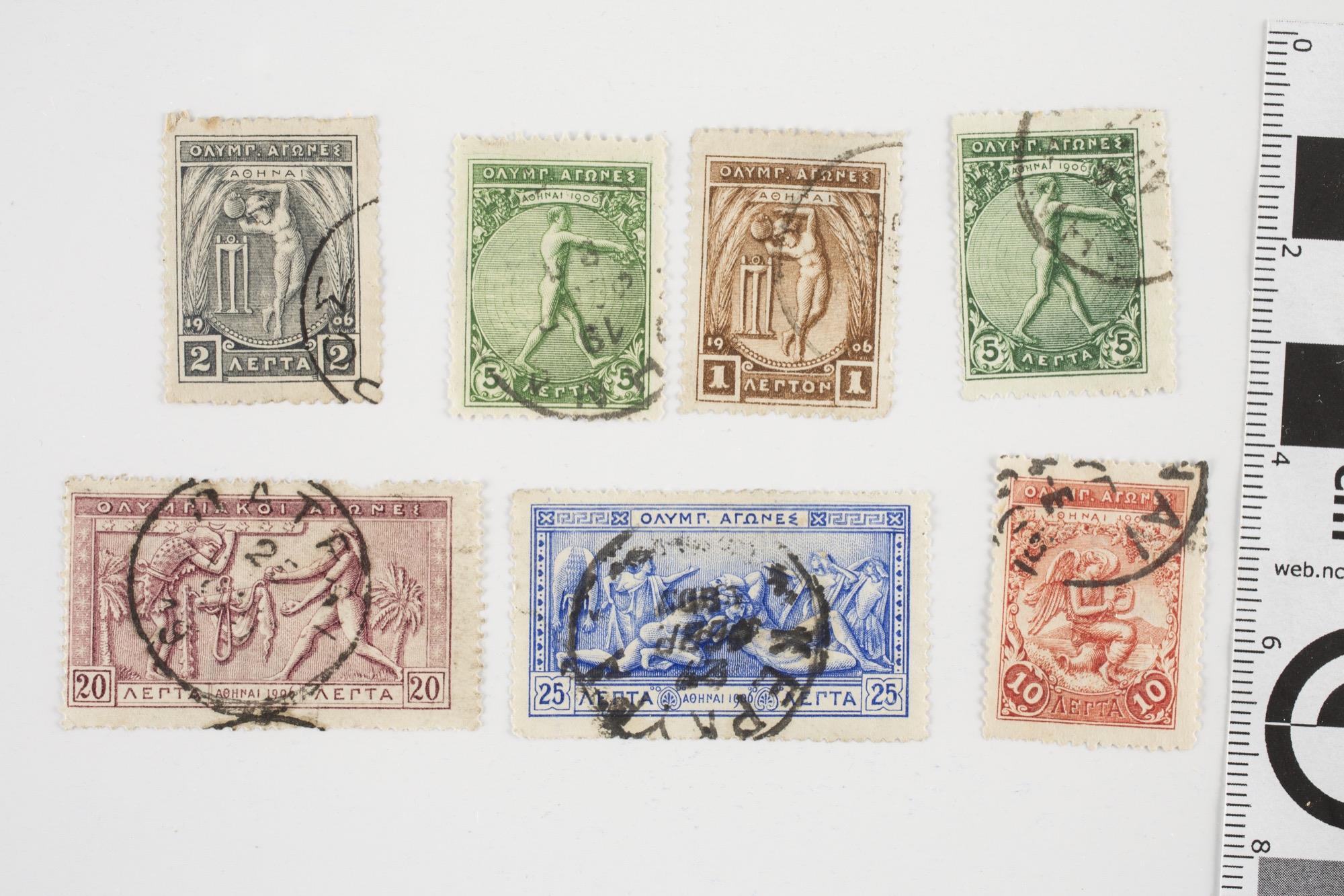 Γραμματόσημο το οποίο απεικονίζει το άθλημα της δισκοβολίας στην αρχαιότητα, στο βάθος εικονίζεται βωμός ενώ εικόνα περιβάλλεται από στάχια. Στην επάνω πλευρά του γραμματοσήμου αναγράφεται "Ολυμπ. Αγώνες, Αθήναι 1906" και στο κάτω μέρος η αξία του, ένα λεπτό. Το γραμματόσημο είναι χρώματος καφέ.