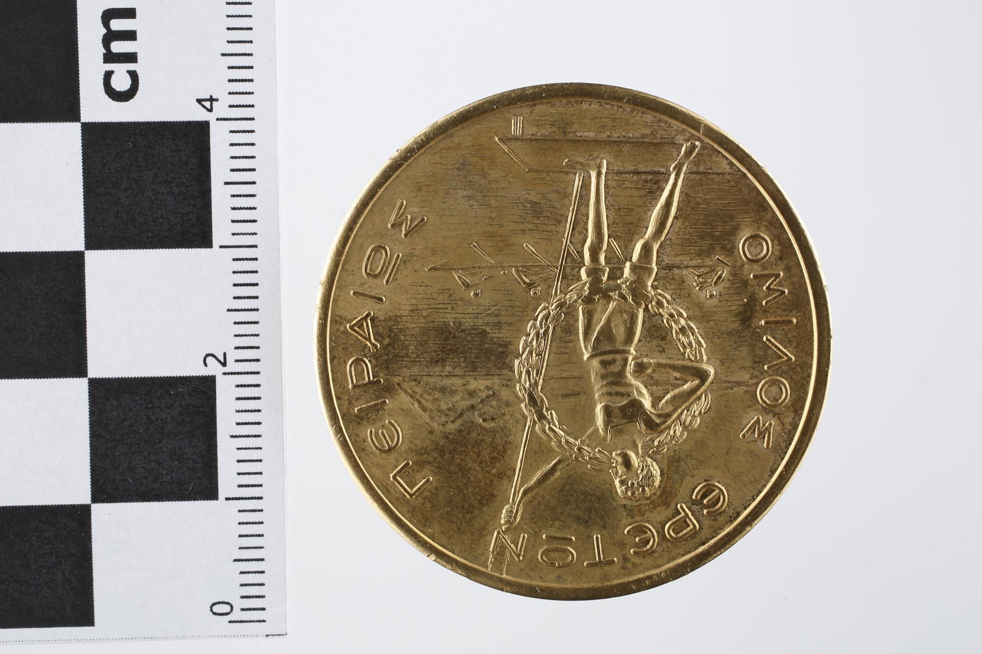 Χρυσό επετειακό μετάλλιο του Ομίλου Ερετών Πειραιώς για τα εκατό χρόνια "1885 - 1985". Στην μια εμπρόσθια όψη εικονίζεται στεφανωμένος νέος που κρατά σε θριαμβευτική στάση ένα κουπί ενώ πίσω του πλέει ένα σκάφος με κωπηλάτες. Στην πίσω όψη υπάρχει η επιγραφή "1885-1985" σε διακοσμημένο, με δάφνες, πλαίσιο.