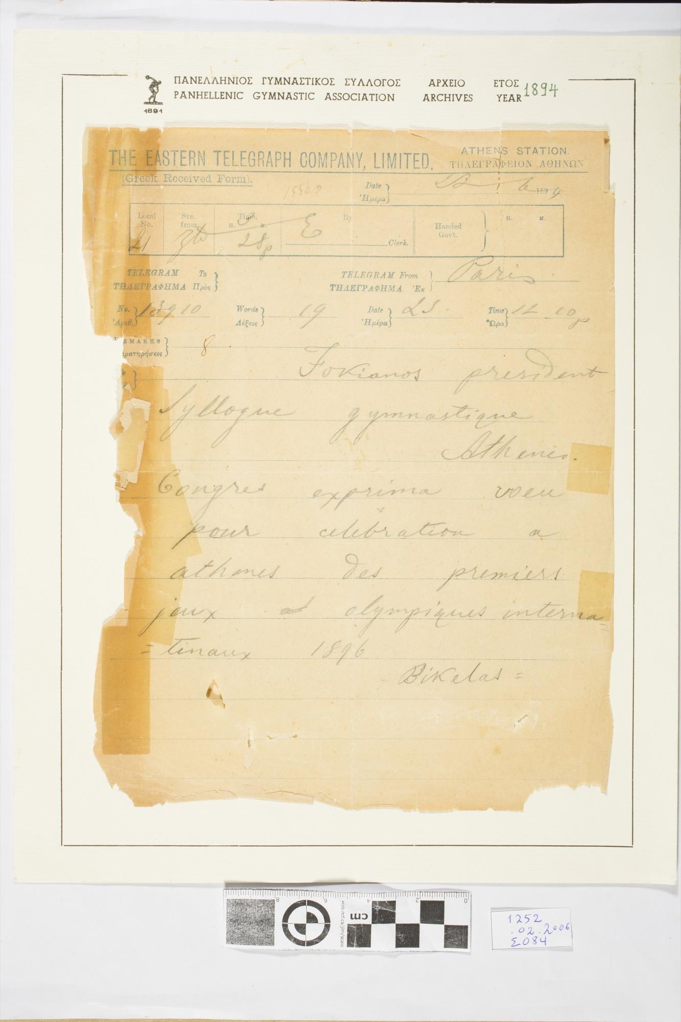 Απόκομμα του τηλεγραφήματος του Βικέλα Δημήτριου προς το Πανελλήνιο Γυμναστικό Σύλλογο ανακοινώνοντας ότι το συνέδριο του Παρισιού εκφράζει την ελπίδα ο εορτασμό των πρώτων Διεθνών Ολυμπιακών Αγώνων να πραγματοποιηθεί στην Αθήνα το 1896. Το τηλεγράφημα έχει συμπληρωθεί χειρόγραφα και έχει αποσταλεί από το Παρίσι στην Αθήνα στις 23 Ιουνίου του 1894.