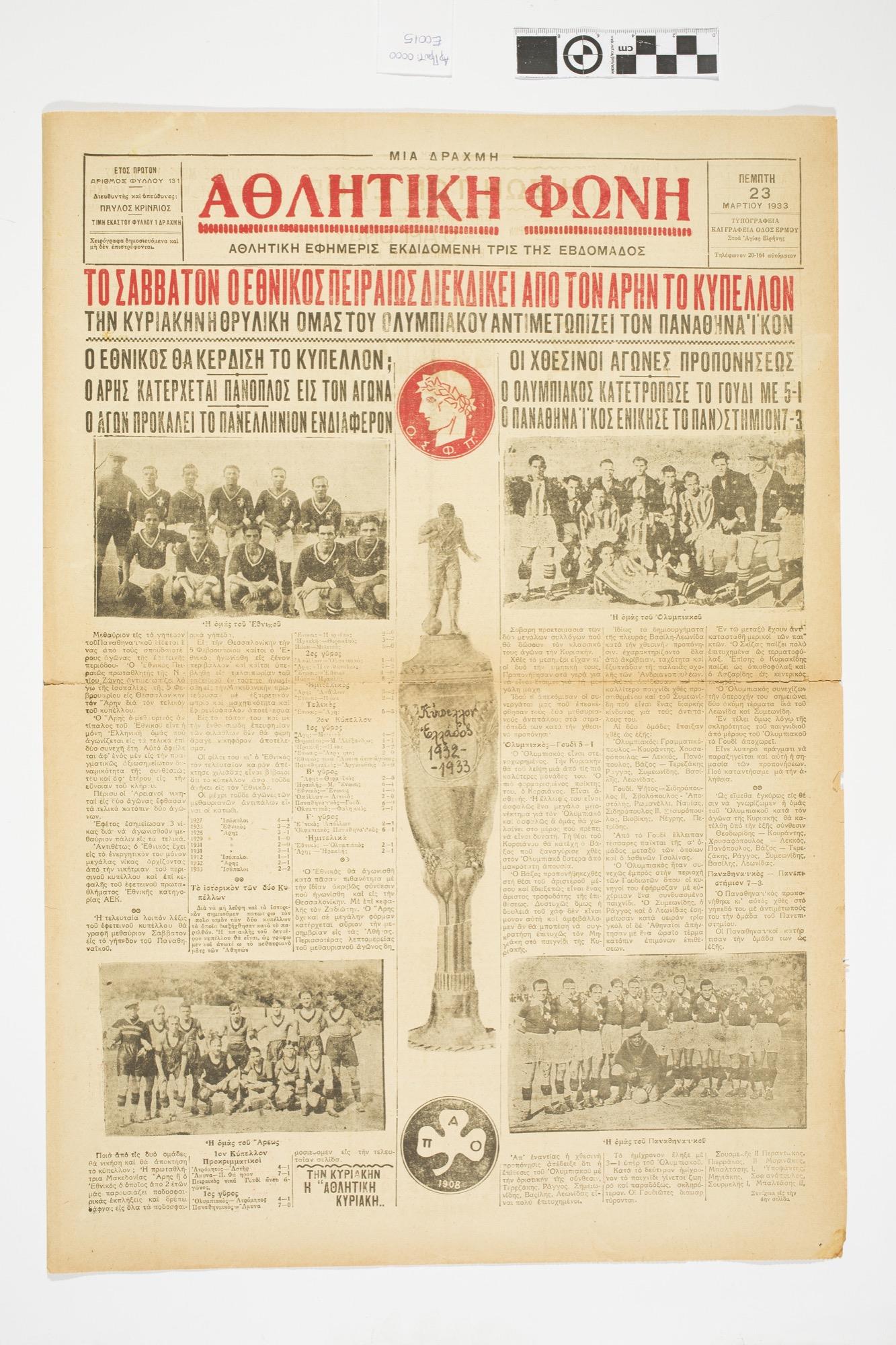 Εφημερίδα "ΑΘΛΗΤΙΚΗ ΦΩΝΗ". Αθλητική εφημερίδα που φέρει τον τίτλο θέματος στο πρωτοσέλιδο "ΤΟ ΣΑΒΒΑΤΟΝ Ο ΕΘΝΙΚΟΣ ΠΕΙΡΑΙΩΣ ΔΙΕΚΔΙΚΕΙ ΑΠΌ ΤΟΝ ΑΡΗ ΤΟ ΚΥΠΕΛΛΟΝ" και τον υπότιτλο "ΤΗΝ ΚΥΡΙΑΚΗΝ Η ΘΡΥΛΙΚΗ ΟΜΑΣ ΤΟΥ ΟΛΥΜΠΙΑΚΟΥ ΑΝΤΙΜΕΤΩΠΙΖΕΙ ΤΟΝ ΠΑΝΑΘΗΝΑΪΚΟΝ". Ημερομηνία έκδοσης: ΠΕΜΠΤΗ 23 ΜΑΡΤΙΟΥ 1933. Αριθμός φύλλου: 131. Διευθυντής και υπεύθυνος: Παύλος Κριναίος
