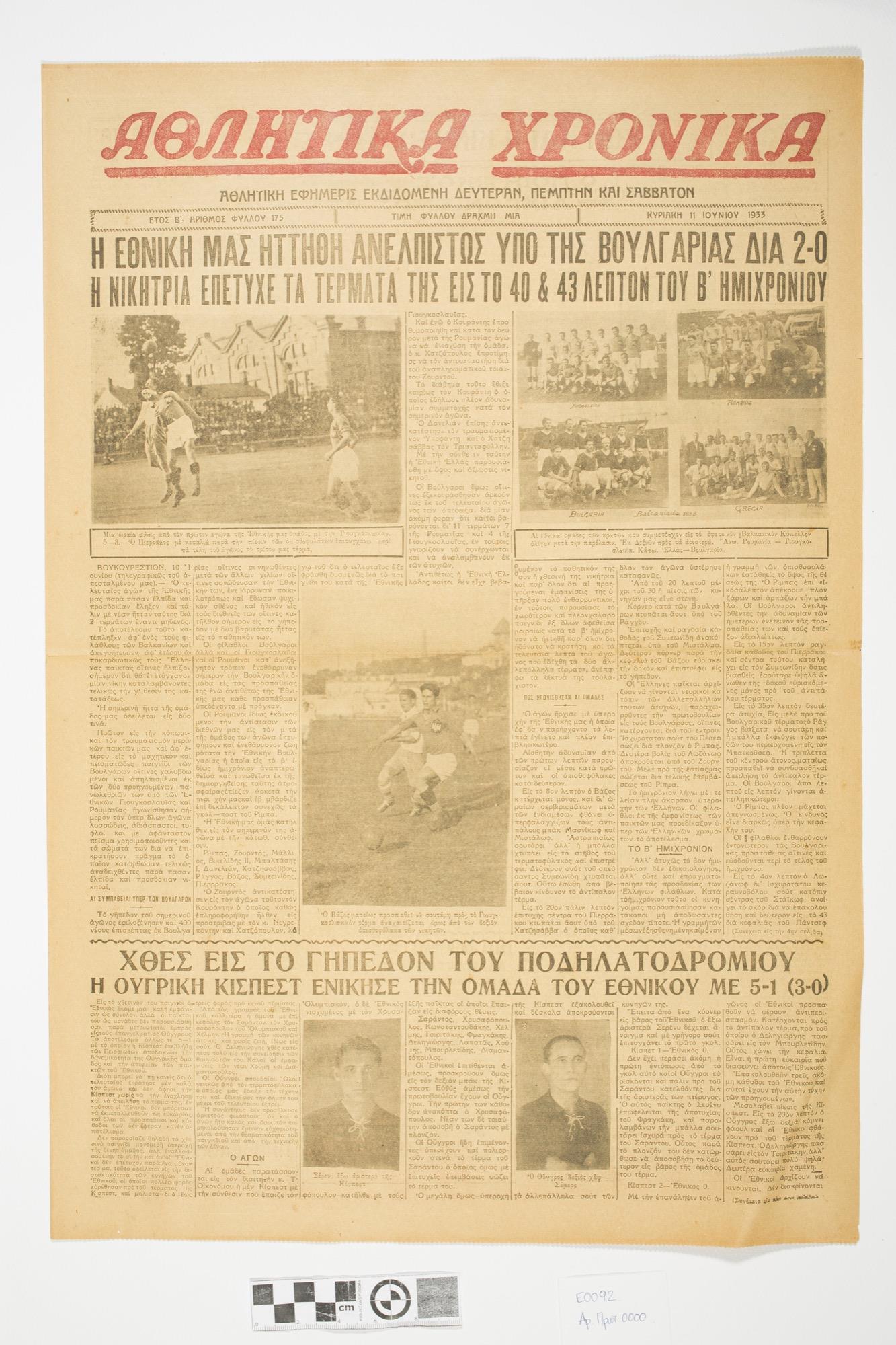 Εφημερίδα "ΑΘΛΗΤΙΚΑ ΧΡΟΝΙΚΑ", αθλητική εφημερίδα. Θέματα πρωτοσέλιδου: «Η ΕΘΝΙΚΗ ΜΑΣ ΗΤΤΗΘΗ ΑΝΕΠΛΙΣΤΩΣ ΥΠΟ ΤΗΣ ΒΟΥΛΓΑΡΙΑΣ ΔΙΑ 2-0. Η ΝΙΚΗΤΡΙΑ ΕΠΕΤΥΧΕ ΤΑ ΤΕΡΜΑΤΑ ΤΗΣ ΕΙΣ ΤΟ 40 & 43 ΛΕΠΤΟΝ ΤΟΥ Β΄ ΗΜΙΧΡΟΝΙΟΥ», «ΧΘΕΣ ΕΙΣ ΤΟ ΓΗΠΕΔΟΝ ΤΟΥ ΠΟΔΗΛΑΤΟΔΡΟΜΙΑΟΥ. Η ΟΥΓΓΡΙΚΗ ΚΙΣΠΕΣΤ ΕΝΙΚΗΣΕ ΤΗΝ ΟΜΑΔΑ ΤΟΥ ΕΘΝΙΚΟΥ ΜΕ 5-1 (3-0).». Ημερομηνία έκδοσης: Κυριακή, 11 Ιουνίου 1933. Αριθμός Φύλλου: 175.