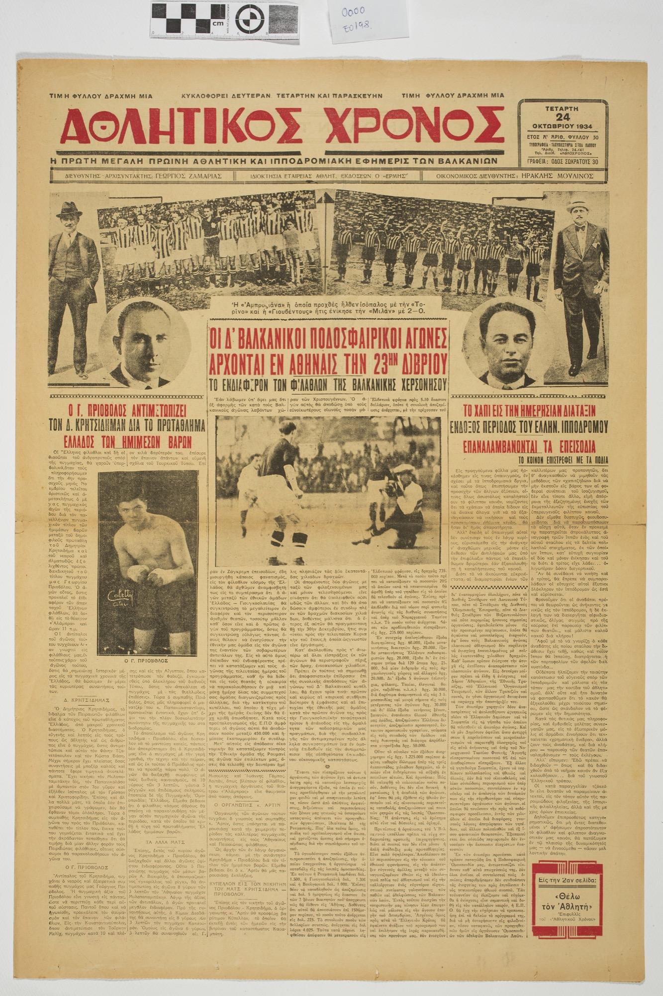 Εφημερίδα "ΑΘΛΗΤΙΚΟΣ ΧΡΟΝΟΣ". Αθλητική εφημερίδα που φέρει τον τίτλο θέματος στο πρωτοσέλιδο " ΟΙ Δ' ΒΑΛΚΑΝΙΚΟΙ ΠΟΔΟΣΦΑΙΡΙΚΟΙ ΑΓΩΝΕΣ ΑΡΧΟΝΤΑΙ ΕΝ ΑΘΗΝΑΙΣ ΤΗΝ 23ΗΝ Δ)ΒΡΙΟΥ". Ημερομηνία έκδοσης: ΤΕΤΑΡΤΗ 24 ΟΚΤΩΒΡΙΟΥ 1934. Αριθμός φύλλου:30