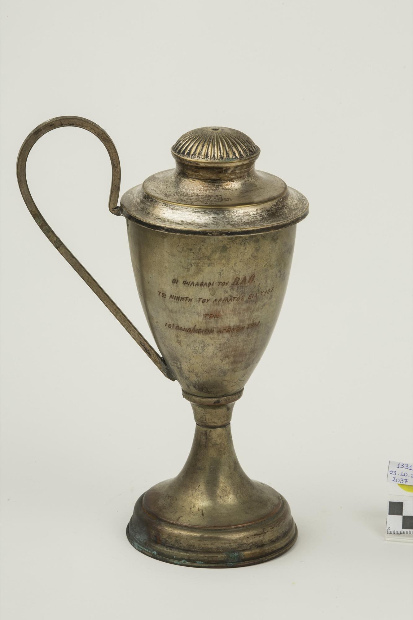 Μεταλλικό κύπελλο φέρει εγχάρακτη επιγραφή "ΟΙ ΦΙΛΑΘΛΟΙ ΤΟΥ Β.Α.Ο. ΤΩ ΝΙΚΗΤΗ ΤΟΥ ΑΛΜΑΤΟΣ ΕΙΣ ΥΨΟΣ ΤΩΝ ΙΒ' ΠΑΝΘ/ΚΕΙΩΝ ΑΓΩΝΩΝ 1948".