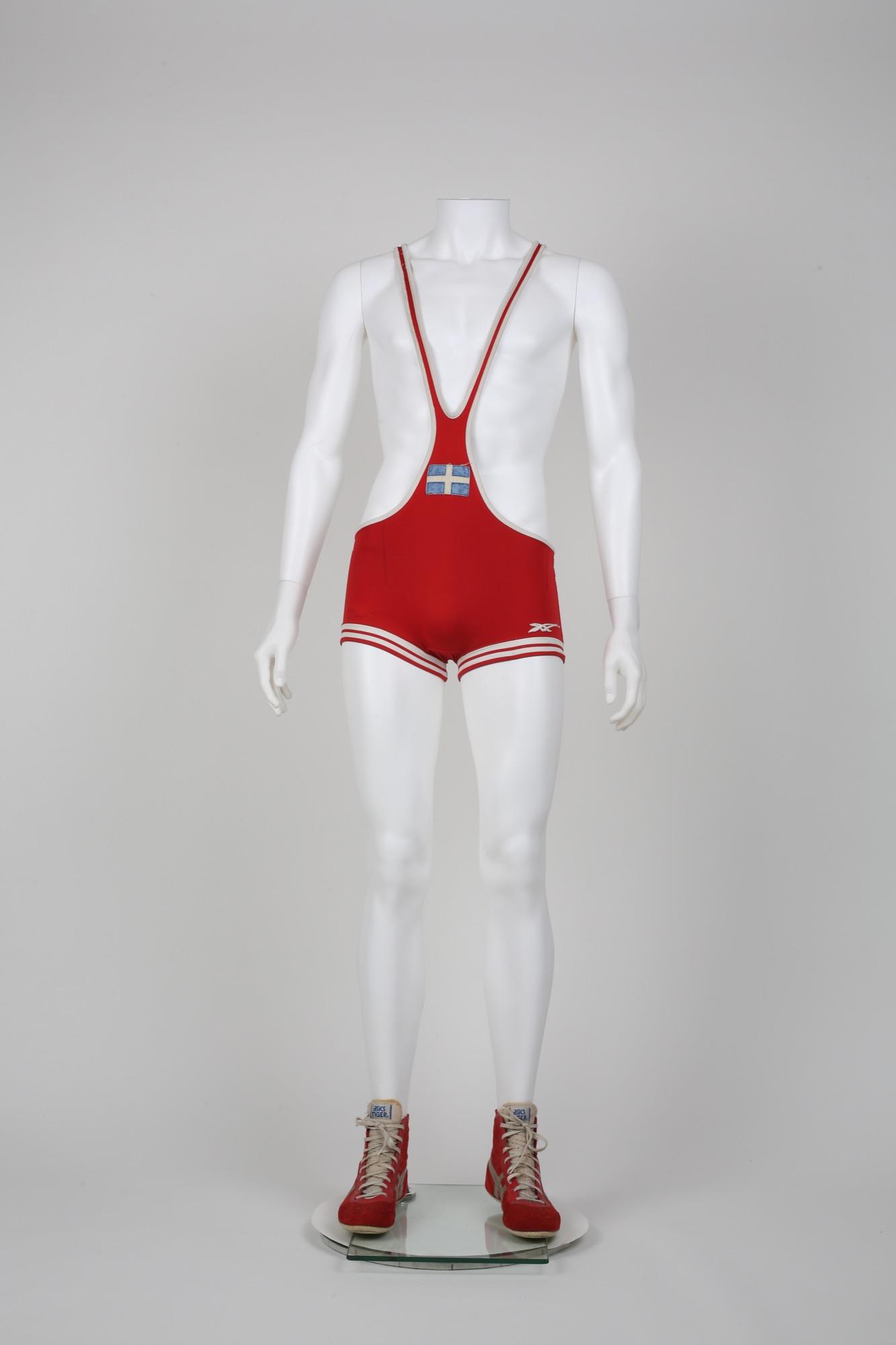 Υποδήματα με τα οποία ο Μυγιάκης Στέλλιος έλαβε μέρος στους ολυμπιακούς αγώνες της Μόσχας. Τα υποδήματα είναι μποτάκια με κορδόνια, επίσης κόκκινου χρώματος.